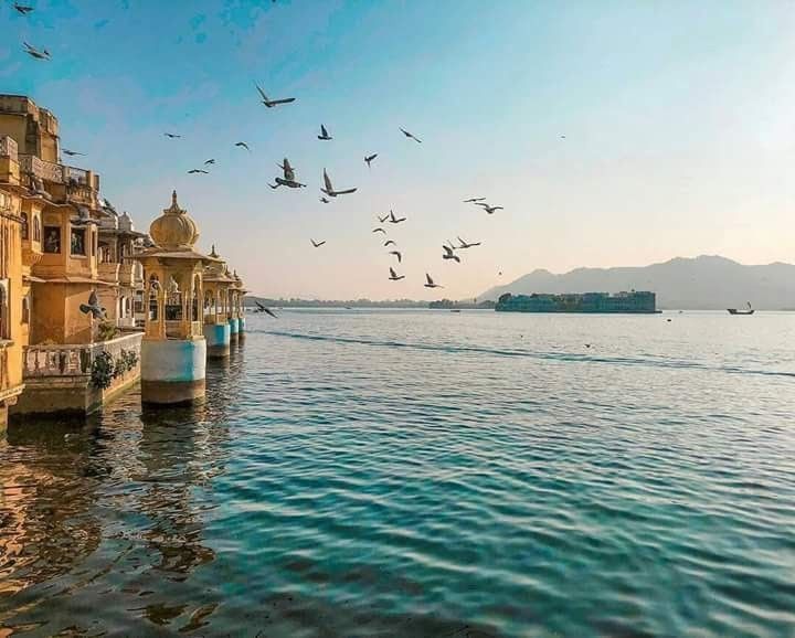 View of Lake Pichola in Udaipur with flying birds, palace architecture, and distant Lake Palace under a clear blue sky