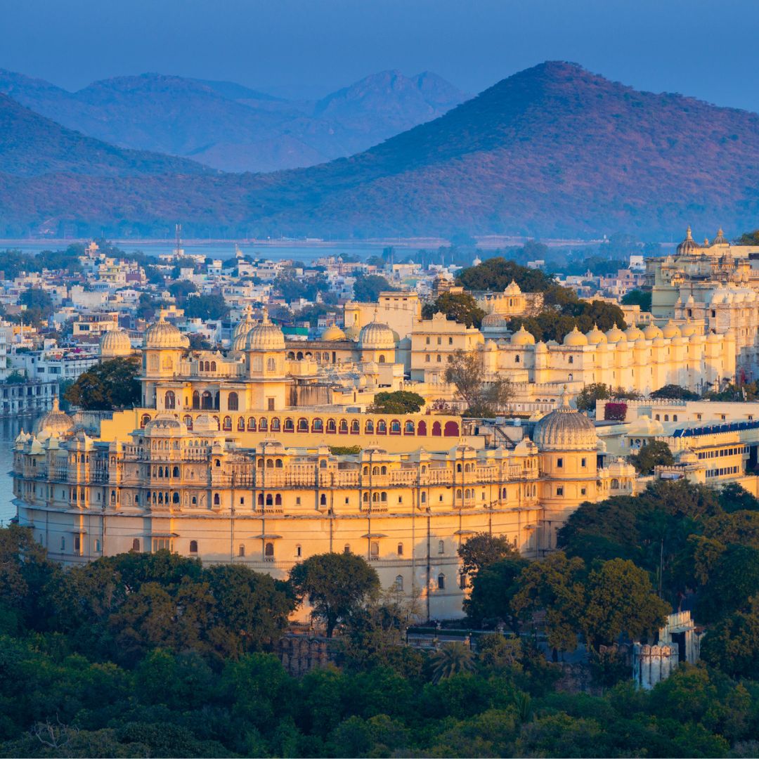 Panoramic view of the City Palace in Udaipur surrounded by Aravalli hills and overlooking Lake Pichola
